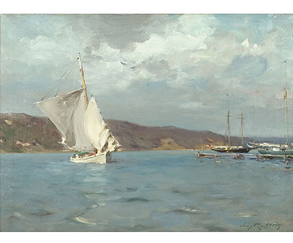 | Irving Ramsey Wiles (1861-1948), White Sloop, Peconic Bay, 1907. Oil on canvas, 21 x 28 inches. Signed lower right.