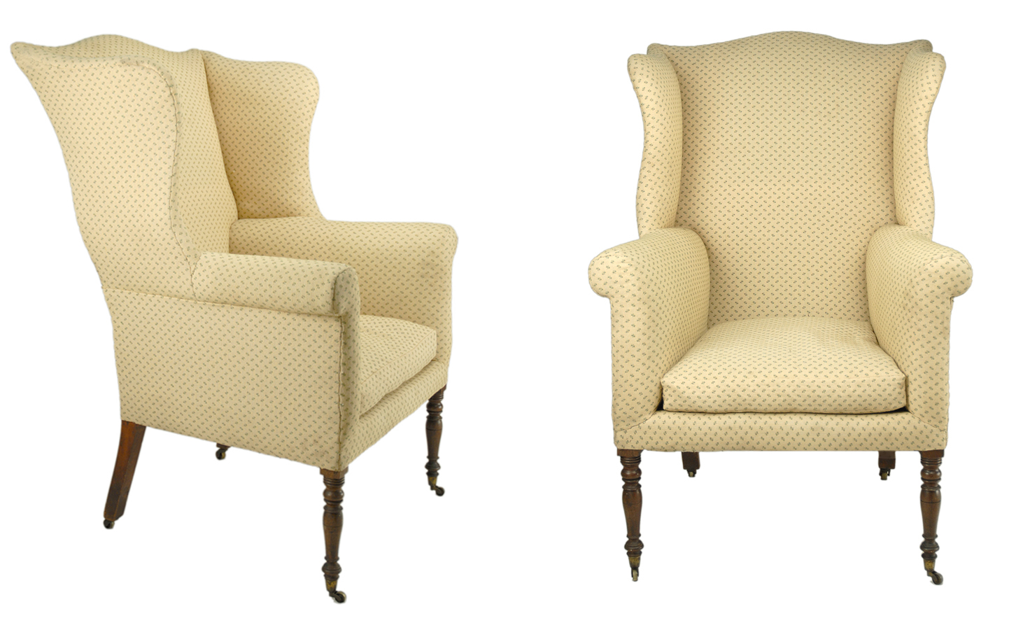 This wing chair exhibits remarkable proportions through both excellent height and an appealing scrolled crest and wings. The nicely tapered seat rests upon mahogany ring turned and tapered front legs.