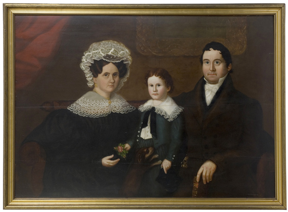 | Oil on wood panel by Susanna Paine, New England (1792-1862) Portrait of The Battey Family, Providence, Rhode Island, 1830. A portrait depicting Mr. Sheldon Battey, his wife Eliza and their son Thomas at about the age of six. Mr. Sheldon Battey (1793-1842), young Thomas Sheldon Battey (born August 21, 1824), Mrs. Eliza Battey (1783-1864) The Batteys are seated in Classical settee with rolled arms and turned crest, beneath a gilt gesso picture frame and a crimson drapery. Susanna Paine, an extraordinary woman and itinerant portrait painter, was born in Rehoboth Massachusetts, June 9, 1792. Her work is prolific as she moved between, Maine, New Hampshire, Massachusetts and Rhode Island throughout her lifetime and career. Here iconic works provide a valued image of American life in the first half of the Nineteenth century.Dimensions: 49 1/4 x 59 1/4" Illustrated: Folk Art; "Roses and Thorns, The life of Susanna Paine, Winter 2005-2006 Volume 30 Number 4, Page 67