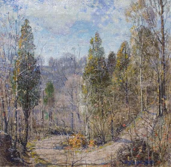 This bright painting displays a dirt road in a forest likely on a fall day due to the sprinking of colored leaves. Titled "The Winding Road" on verso.