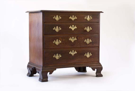 Chest with an overhanging molded top, four graduated drawers and bold ogee bracket feet. It has an old nineteenth-century finish. Pennsylvania, circa 1770. The brasses are replaced.