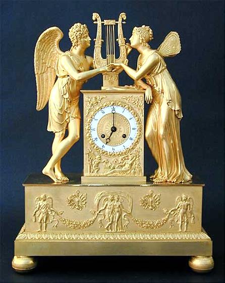 This spendid Empire clock depicts Cupid and Psyche in an adoring pose. The detail on the wings and the drapery of the clothing is exceptional. The works and case have been professionally cleaned.