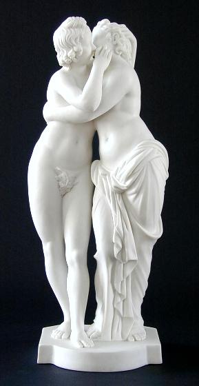 This terrific parian example depicting Cupid and Psyche is after the antique marble which is now in Rome at the Capitoline Museum. A parian example was shown at the 1849 Birmingham Exhibition. The base is impressed Minton and various other marks including the year symbol for 1865.