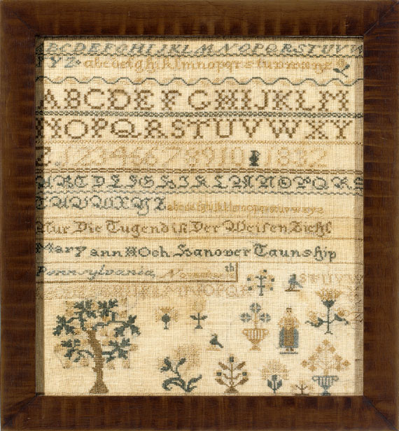 This is a very interesting sampler, notable for many reasons. Both Pennsylvania German and Anglo motifs and treatments were included by Mary Ann; although the overall sampler bears a far closer relationship to those made within the Pennsylvania German communities. Typical of that type of sampler, this is without a border, and the bottom register features many motifs arranged in a floating or random fashion. One of these has been documented on samplers made by the Schwenkfelders, a sect that lived predominantly in Montgomery County, Pennsylvania. Others have their origins in German samplers from the 17th and 18th centuries: the fruited tree motif, the lady with an open–front gown and the font used for the inscription and one of the uppercase alphabets. Much of this information is documented in a letter written by Tandy and Charles Hersh regarding this sampler.