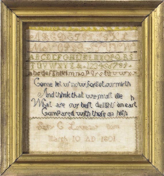 It was made by Sally G. Lovejoy, who states on it that she was born on March 10 of 1801. Sally's ancestors had lived in America for seven generations and their founding father was John Lovejoy who emigrated from England and was one of the first settlers of Andover, Massachusetts. According to the History of the Town of Wilton, Hillsborough County, New Hampshire by Livermore and Putnam (1888), Sally's father, Henry Lovejoy was born in Andover in 1753 and served in the Revolutionary War in campaigns in Vermont and Rhode Island. Henry married Elizabeth Cummings and they settled in Wilton, a small town approximately 20 miles southwest of Manchester. Sally's sampler includes alphabets and a moralistic verse which is typical of the period; it exhorts us to forget our mirth on earth when compared to the delights of heaven.