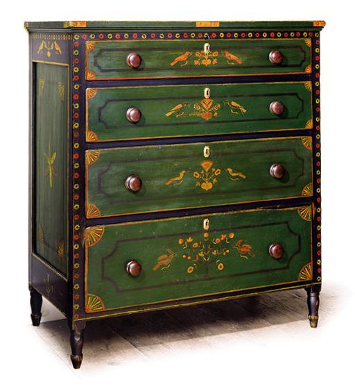 A classic Pennsylvania decorated chest of drawers from the Mahantongo Valley -- retaining its exceptional green and blue painted finish with birds, flowers, rosettes, fans and compass point designs in yellow, red and black. This outstanding example is attributed to Johannes Mayer (1794-1883) and is dated 1830.