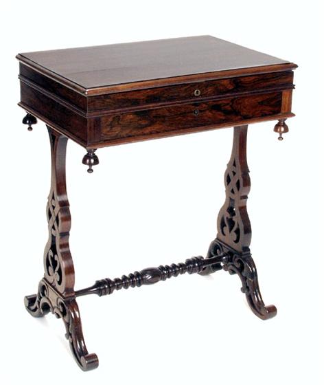A Rosewood Table with a pierce carved trestle base & a fitted maple interior, bearing the label of Alexander Roux, one of New York's better known cabinetmakers of the 19thC. Measurements: 24" x 17-1/2" x 31-1/2" tall