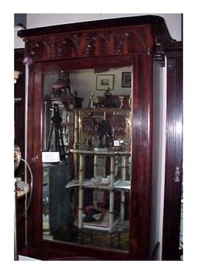 American Gothic Revival Armoire also in the classical and empire styles, New York, circa 1840, original finish has been cleaned and repairs to veneers, interior is a figured maple with original maple shelves, mirror has probably been replaced as it is rebacked Gothic Furniture of this calibre is difficult to come by, 42 inches wide, 26-1/2 inches deep & 87-1/2 inches tall.