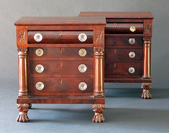 This delightful near pair of miniature bureaus represents fully developed designs of the Classical period. The rectilinear case is ornamented with fully engaged columns with carved capitals and turned bases, beautifully carved front feet, and well turned rear feet. The drawer fronts are veneered with rich crotch mahogany and a lighter wood inlay around the faux key escutcheons. A full family provenance is recorded in one of the drawers beginning with Martha Ridgeway Bannan in 1837 through Martha Ridgeway Bannan Harris Dean in 1924.