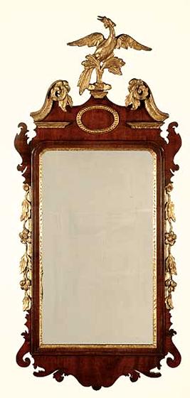 Fine Chippendale Mahogany and Parcel-Gilt Looking Glass having a broken arch top with gilded scrolls, rosettes and pendant leaves centered by a carved and gilded phoenix over a carved and gilded oval with raised beads all above shaped ears, a rectangular mirror plate with a gilded inside mirror border flanked by gilded pendant leaves and flowers all above a shaped base.