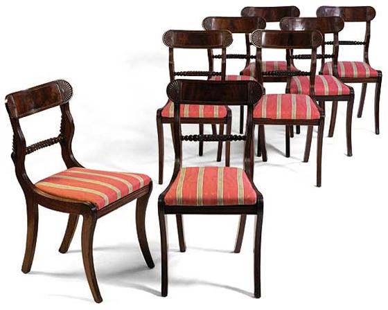 Set of eight mahogany chairs of Klismos form. Circa 1815-1825. Height 34", Width 17-3/4", Depth 17"