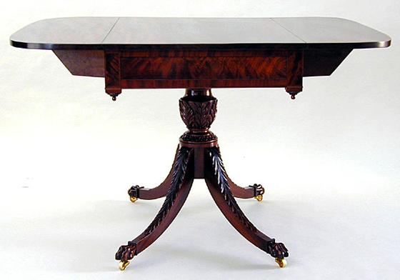 This splendid breakfast table has beautifully figured mahogany boards and veneers. A drawer is concealed in the apron which is appointed with turned finials. The foliate-carved urn and shaft are supported by splayed legs with waterleaf carving above carved paw feet on original brass casters.
