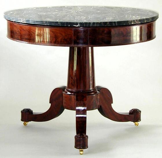 This splendid center table features nicely figured mahogany veneers and design elements representative of the New York taste. A reeded circular "Egyptian" marble tops a conforming molded apron with three applied rectangular panels. The whole is raised on a tapering column with a circular plinth supported by outward sweeping legs with cylindrical feet on brass casters.