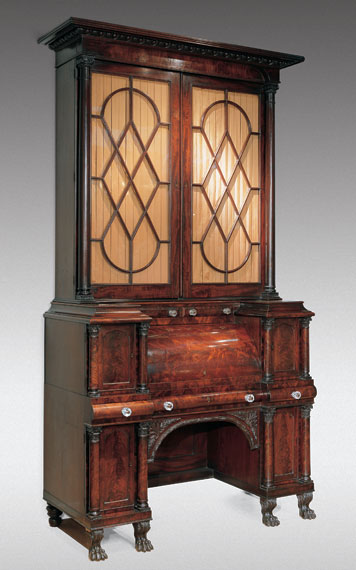 Important Carved Mahogany Cylinder Secretary Bookcase