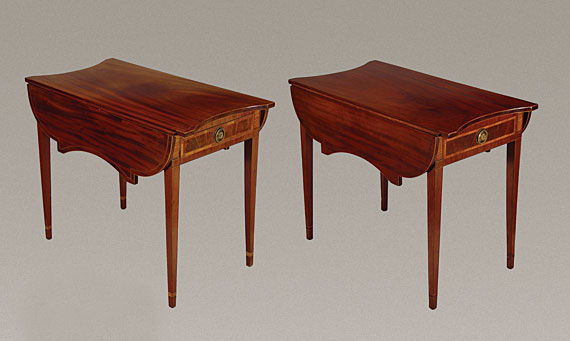 These highly inlaid mahogany tables have dramatically shaped drop-leaves and a history of ownership in Central Connecticut.