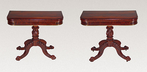 This pair of figured mahogany and brass inlaid tables each bear the stenciled label of Alexander Kinnan and States Mead, Broadway, New York. (Partners 1823-30).