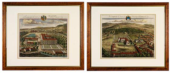 This pair of hand colored copperplate engravings were done by Belgian artist Johannes Kip. These faithful representations were published in London in the early 18th century. 26 x 22 inches.