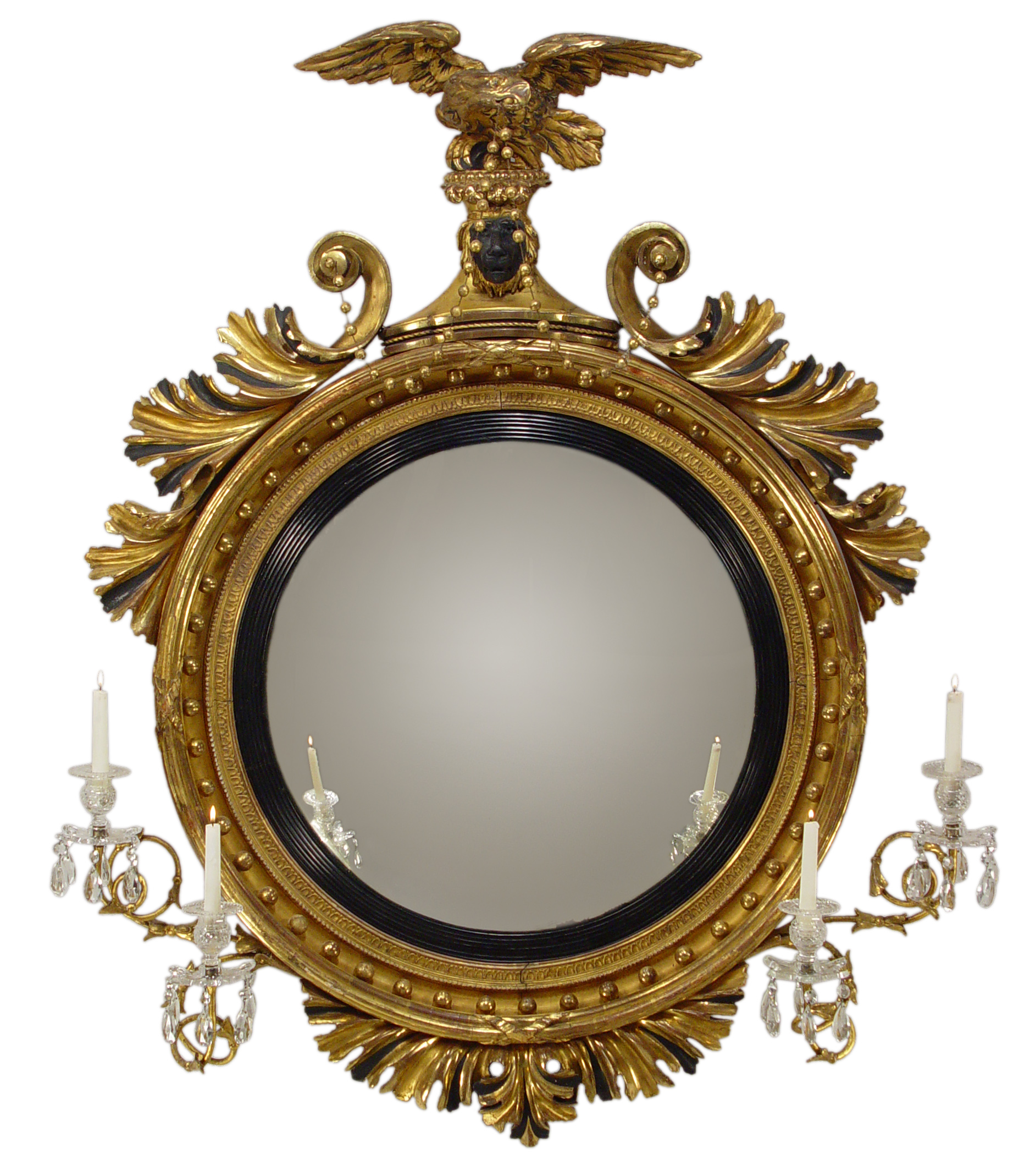 A Monumental Classical Gilt Wood Girandole Mirror, circa 1820. This exceptional large scale girandole mirror features a full bodied carved American eagle on a plinth mounted with an ebonized lion face. The richly carved foliate ears and lower drop, frame the original convex looking glass. The four gilt scrolled candelabrums support cut crystal candle holders above crystal boubeche with drop prisms.