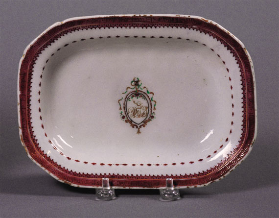 Sauce Tureen Stand with Crimson Trellis Border and Shield in the center with C over D.T.B. Circa 1795.