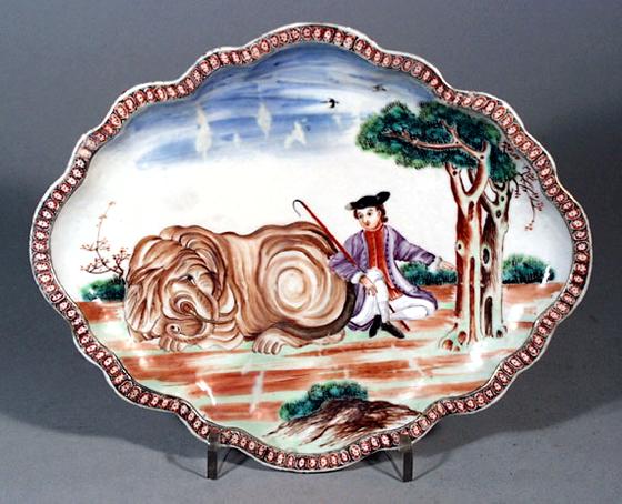 The dish, of lobed oval form, is decorated in famille-rose enamels, with a scene depicting a European figure wearing a puce jacket, iron-red waistcoat and white breeches, and holding a crock in one hand. He is seated beside a recumbent elephant, the beast looking over its shoulder at the mane. The elephant's hide is in tones of sepia, with gilded tusks. There are two trees to one side and a pair of birds above flying across the blue sky, all within an iron-red circle diaper border.
