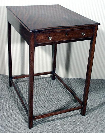 The mahogany table has a single drawer at one end. It stands on four tapered legs with thin mahogany stretchers between each.