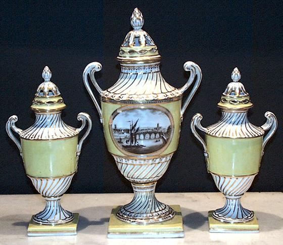 The garniture of French style vases each stand on a square yellow ground base with a gilt edge. The vases have a beautiful yellow ground within a gilt surround while the taller central vase has a sepia panel depicting a view of Worcester. The soccal, shoulder and neck are painted with a moulded spiral design in gilt and white. The domed covers are pierced and have a bud finial.