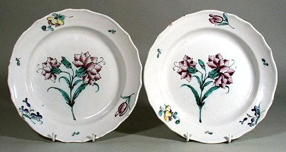 The pair of faience plates each are stylistically painted with a sprig of a puce double carnation. Other floral sprigs decorate the shaped rim; minor chips to rim.