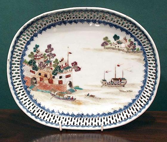 The oval dish with an openwork reticulated rim with two bands of underglaze blue surround a central design painted in the central well with a scene of a folly fort on the River Pearl near Canton. The folly fort is depicted in great detail. Around it are several Chinese boats and ships. In the background is another island with buildings and trees.