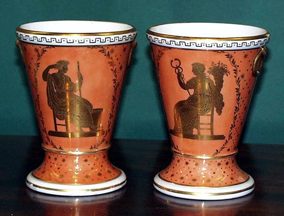 The pair of Flight and Barr Worcester orange or apricot ground jardinieres or cache pots were probably decorated by Thomas Baxter in the London studios. The cache pots have fixed mooring ring handles and are superbly decorated with classical figures, one with a staff, the other with a caduceus and cornucopia on a dot and star ground. One cache pot with old invisible repair