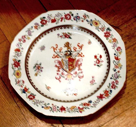 These finely painted plates are copies of a Chinese Export service made for William Mills of Clapham who had married Elizabeth daughter of James Hatch of Clabery Hall in Essex. Their second son, Christopher-John, also married a daughter of another James Hatch of Clabery about 1810. One can speculate that this service was ordered on the occasion of that marriage.