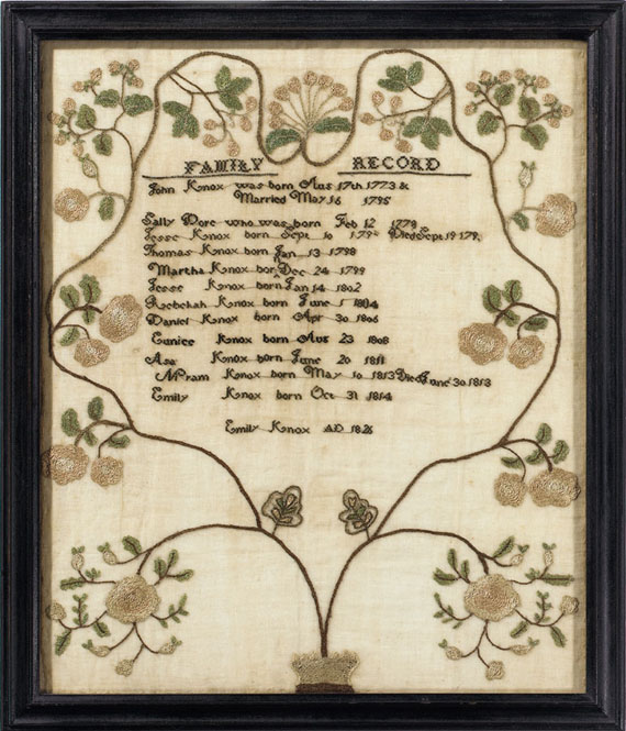 This is an outstanding and aesthetically pleasing Family Record sampler, with the vital statistics worked within a framework formed by a highly creative flowering plant. The stitching indicates a very high level of expertise and was accomplished onto almost impossibly fine linen gauze; clearly both the samplermaker and her teacher were talented needleworkers.