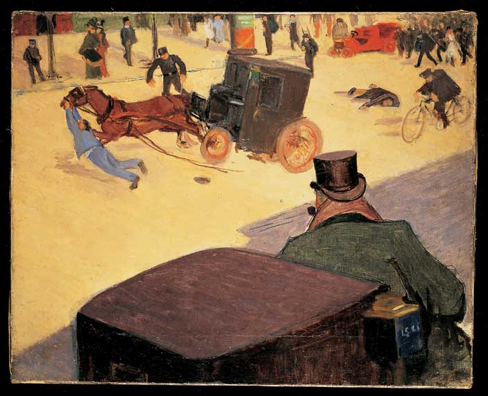 L'Accident d'un Fiacre, initialed by the artist G. Ibels; oil on canvas, 33 x 41 cm. Nineteenth century.