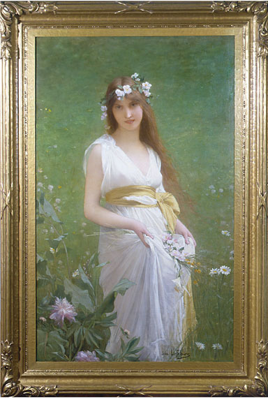 Jules Lefebvre (French 1836-1911), Springtime; Oil on canvas, 55-1/2 x 34 inches (67 x 45 inches framed); Signed lower right.