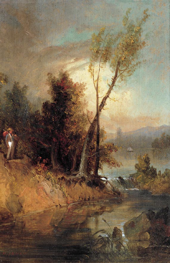 | At Stony Brook, 1831 Signed H. Inman, lower left Oil on panel, 12 1/2 x 8 1/2 inches provenance: Shephard Alonzo Mount, Stony Brook, New York Charles B. Wood, purchased 1859 By descent in the Wood family, Connecticut and New York Private collection, Texas Henry Inman visited the William Sydney Mount home in rural Stony Brook, Long Island, for the first time during the winter of 1830. Inman admired the beautiful landscape of the distant New England shore that lies exactly opposite Stony Brook, and he did some pencil sketches of quail that he presented to the Mount family. Inman returned in October of the next year and found refuge in the studio of Shepherd Alonzo Mount, where the present landscape was painted, as duly inscribed on the reverse.