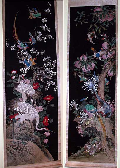 A fine pair of 19th century hand painted scrolls on paper mounted silk, with images of birds and flowering trees. Chinese, c. 1840