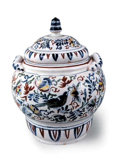 A rare London delft covered jar decorated with birds and flowers, c. 1710.