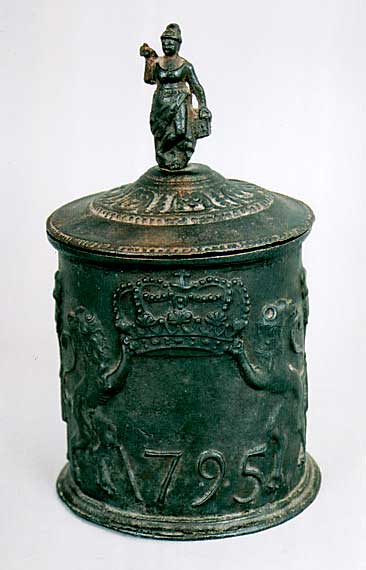 A superb rare cast iron tobacco jar dated 1795 a tavern scene on the reverse side.
