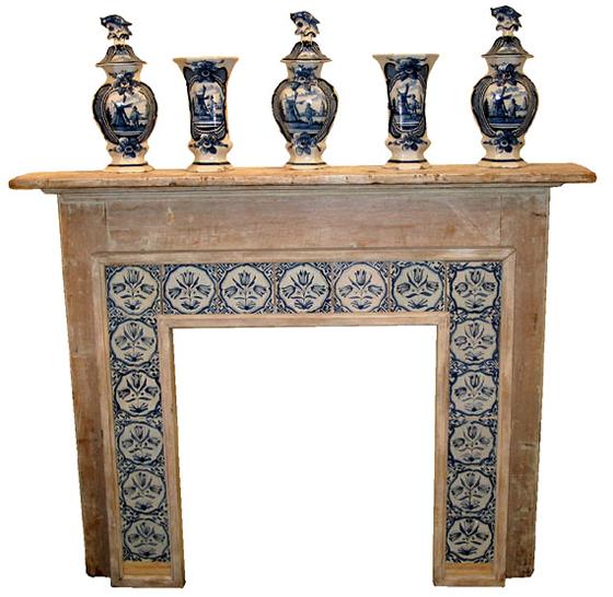 Five Piece Mid-18th Century Signed Delft Garniture Set Above an early New England mantel enclosing a set of early 17th century cobalt blue and white triple tulip tiles.
