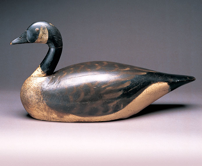 | Canada Goose by Elmer Crowell (1862-1952), East Harwich, MA, circa 1915 This is one of the finest Crowell Canada Goose decoys known. One of the three decoys out of the famous Winward Prescott rig that was found in the Beach and Bass Shop in Little Compton, Rhode Island. This bird is in excellent condition with no repairs or restoration. Retains an early oval stamp, as well as the 'WP' stamp for Winward Prescott. This exact decoy is pictured on page 15 of the Decoy Collector's Guide by Hal Sorenson, Vol. II, No. II (Issue 6) April, May, June, 1964. Length: 23 inches Height: 11I inches Width: 7 inches