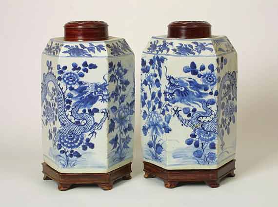 Home | Dealers | Black Pearl Antiques & Fine Art LLC | Chinese Kangxi Blue and White Hexagonal Jars