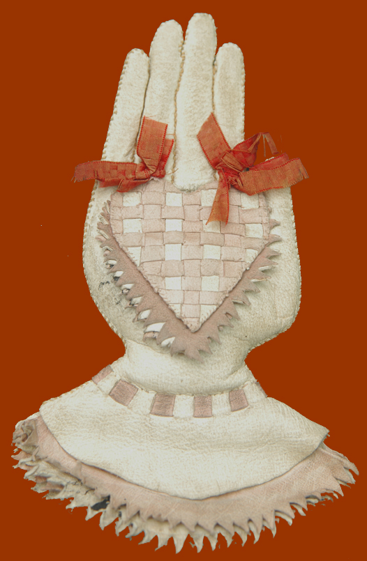 This heart-in-hand pen wipe is a three-dimensional hand of white kid leather with a heart of woven pink and white leather which sits upon three serrated-edge leather hearts of mauve, white, and pink. The wrist of the hand has a woven leather bracelet and the pen wipe leaves are serrated edged leather that is stuffed into and falls below the cuff. Two bows of darker pink ribbon (the ribbon is less red than this photo shows) adorn the fingers. The hand measures 6 1/2" tall. Conditon is wonderful but for some expected dirt on the white leather and ink stains on the interior leaves.