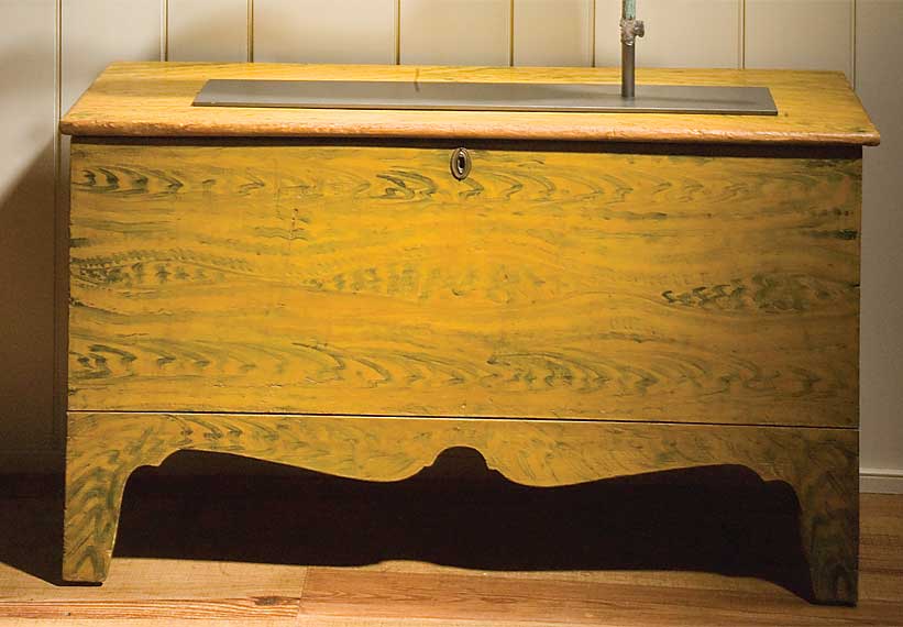 With original yellow and green paint decorated finish. New England, c. 1820. 41-1/2 x 15-3/4 x 25 inches