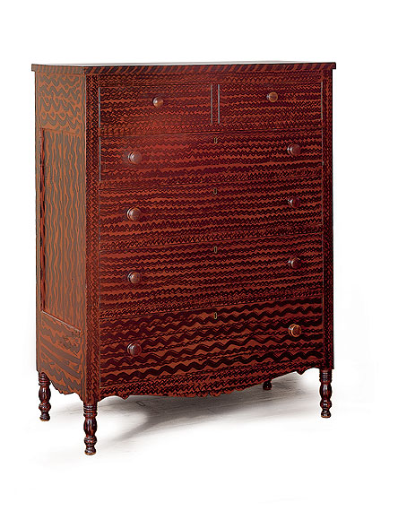 "Ric Rac Chest" Lancaster Co., Pennsylvania Cherry and Poplar with outstanding original grain painted finish. W 39", D 19 3/4", H 50 3/4". Circa 1830.