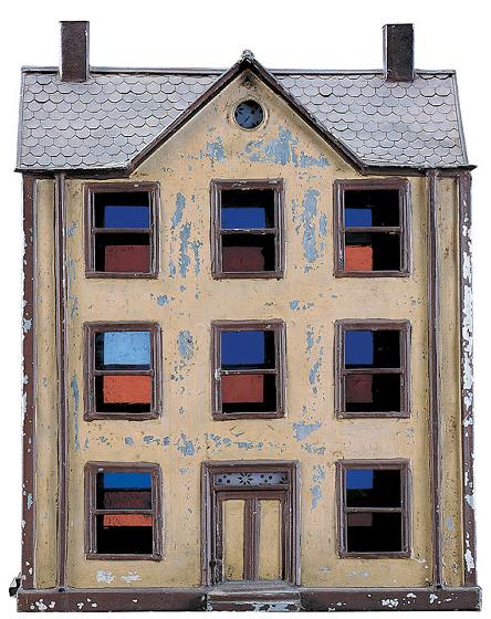 Intended as a lantern, with colored glass at the windows, scalloped roof tiles, original paint,a reminder to pick up a signed copy of my new book at The American Antiques Show,Home Sweet Home: The House in American Folk Art