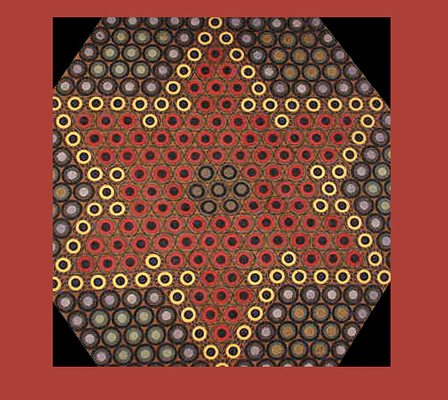 "Six Point Star" Hexagonal Penny Mat Wool suiting discs layered in graduated sizes. 54" x 68".