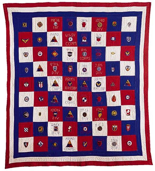 Circa World War II, pieced in a patriotic Straight Furrow pattern, each block centered with an insignia patch and the embroidered names of various units. Published: Quilt Engagement Calendar.