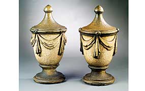 Home | Dealers | Aileen Minor American Antiques | PAIR ANTIQUE GLAZED TERRA COTTA URNS