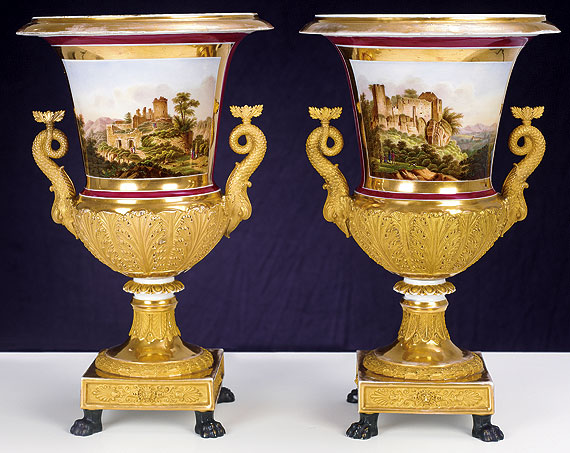 Richly gilded with finely painted landscape scenes, dolphin form handles, and resting on animal paw feet. On reverse are gilded cartouches with initials 'TBD' in italics.