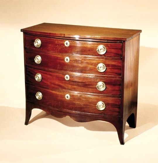 A mahogany bow front Hepplewhite chest of unusually fine form, stance, and color.