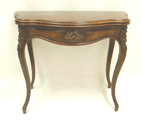 A Rosewood Rococco Serpentine Card Table by Alexander Roux with carved grotesque masques to front legs. Back section pulls out, revealing game piece compartments, on which is stamped Roux label. (see photo)